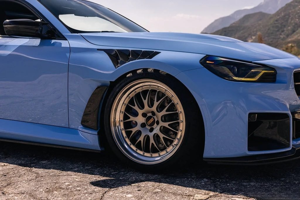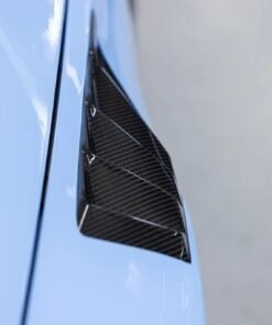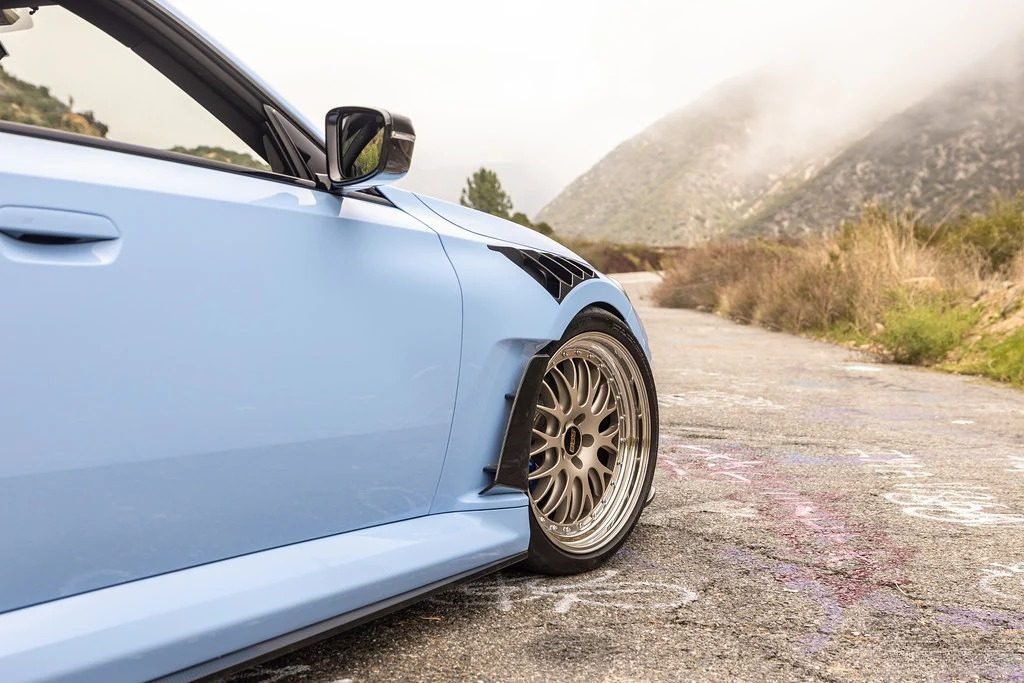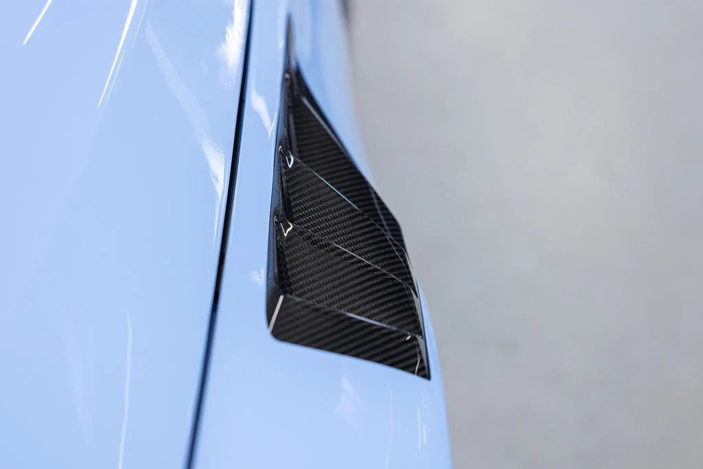 Similar to their previous generation fenders, Alpha-N’s G87 V4 carbon fender set incorporates the same fender louvers and aero blade elements as found on the new 992 GT3 RS. As air flows into the left and right coolers through the M2’s front bumper and into the wheel wells, it can escape via the front fender louvers and the blade openings near the doors. This significant air evacuation reduces pressure within the front fenders, enhancing downforce. To fully utilize the improved aerodynamics, Alpha-N’s Wheelhouse Adapters (vented fender liner inserts) must be installed. The fender set is constructed entirely from pre-preg carbon fiber in a classic 2×2 weave, making the Alpha-N G87 M2 Carbon Fender Set both lightweight and highly functional.