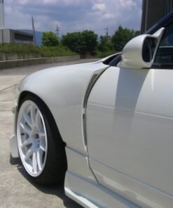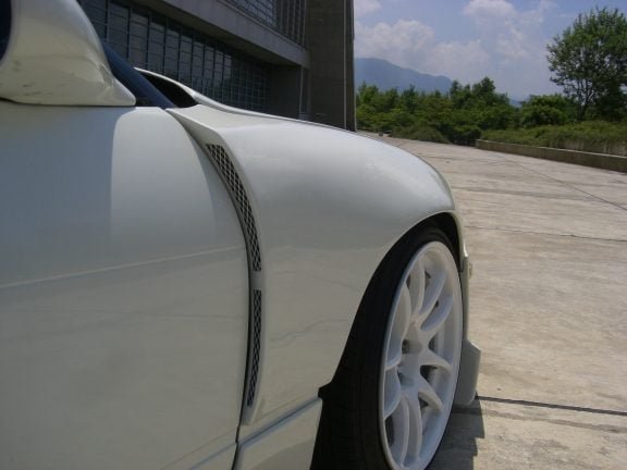 Designed and manufactured by Garage Mak, this front blister fender is created specifically for the Nissan RPS13 Silvia. This product gives the car a wide, aggressive impression from the side, and works best with the type 2 front bumper, side skirt, and rear bumper. If interested, please contact us at Bulletproof Automotive for more information regarding pricing, fitment, shipping costs, as well as installation recommendations.