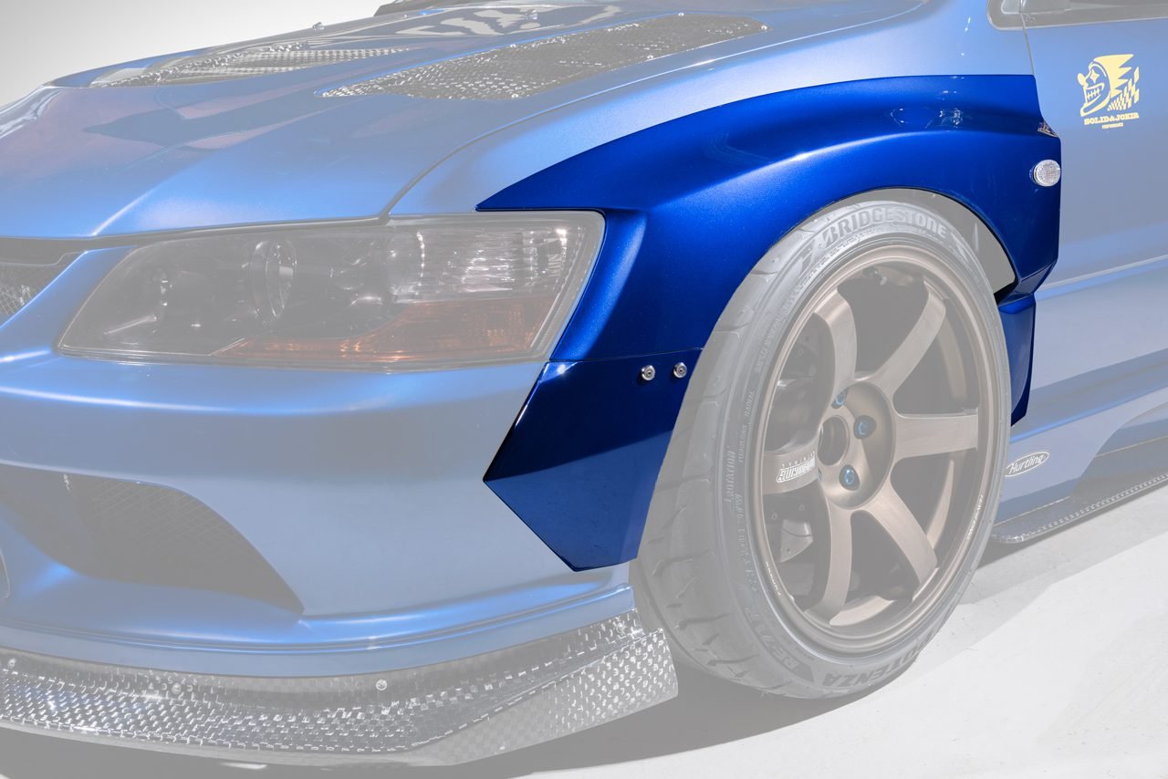 Designed with a more youthful aesthetic, the Hurtling Solid Joker collaboration series developed with Varis offers a more playful style than traditional Varis offerings and has a fun character to it. This aero suite will make your Evo stand out without looking like it got lost looking for the Track. This fender set can only be used as a part of the Solid Joker Widebody for the Evo IX and is intended as a replacement part.