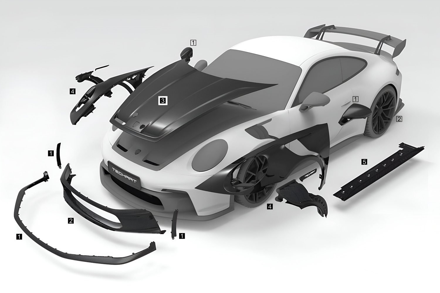 Upgrade the aerodynamics and style of your Porsche 992 Carrera or GT3 with TECHART’s precision-engineered Aerodynamic Fenders. Designed to enhance both performance and aesthetics, these fenders widen the front stance by 15mm per side, improving airflow and stability at high speeds. Crafted from lightweight carbon fiber, they feature integrated wheel arch louvers to reduce lift and optimize cooling. Available in a paint-ready finish or striking exposed carbon options, these fenders ensure a seamless fit while adding an aggressive motorsport-inspired look. Each set includes left and right fenders with TECHART branding, delivering both function and unmistakable presence.