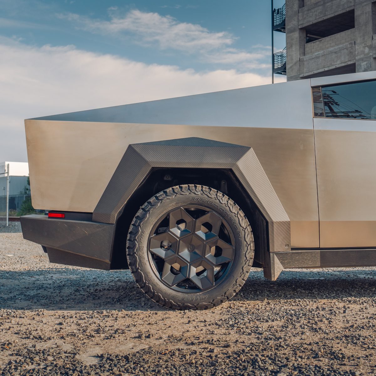 The UP INVINCIBLE® Wide Fender Flares add a sleek, subtle, yet aggressive appearance to the Cybertruck’s stature. Made out of prepreg carbon fiber with a bulletproof-inspired Kevlar backing, these fender flares keep a stock-like design that is wider, bolder, and more badass with their exposed carbon shell. With each side adding 20mm at the front and 30mm at the rear for a total max width increase of of 60 mm, the V2 carbon fiber fender flares give the Cybertruck and aggressive stance and are perfectly designed and sized for our UP Forged CYBRHEX wheels as well as our UP-03 Forged Beadlock wheels. For those wanting to retain the stock Cyberwheel, you can get the perfect fitment with these V2 fenders using UP INVINCIBLE® 30mm or 50mm Wheel Spacers.